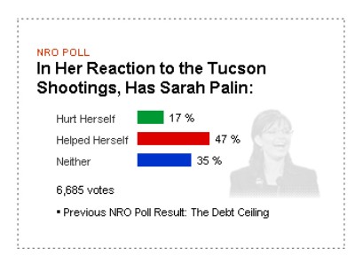Palin's 38% favorable rating is her lowest (by two percentage points) since she became a well-known political figure after the 2008 Republican national convention, and her 53% unfavorable rating is her worst by a point. Palin has been a central figure in the recent debate over whether political rhetoric -- including hers -- was partly behind the Tucson shootings. Last week, she responded to these allegations by posting a much-publicized video response on the Internet. The recent news has not done much to change Americans' opinions of Palin, though.National Review: